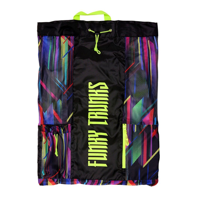 Carry and store all your swim training gear on pool deck in this versatile, spacious mesh backpack that includes a water-resistant pocket and adjustable shoulder straps.